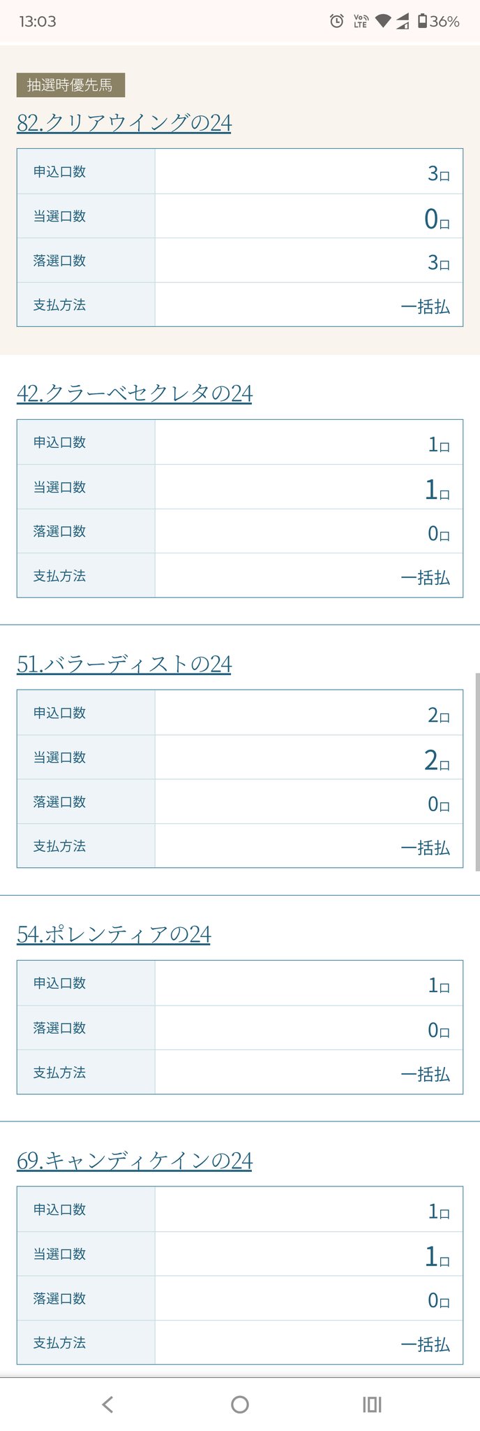 キャロットは3頭。最優先は貯めてもうまく使えないのでそこそこ人気のナダル産駒に行ったけど一般でもナダルが当たってもう一頭もこの世代3頭目のマインドユアビスケッツと前年とは違って父がかぶりまくり。育成はみんなダートっぽいのもあってそんなに早くなさそう。